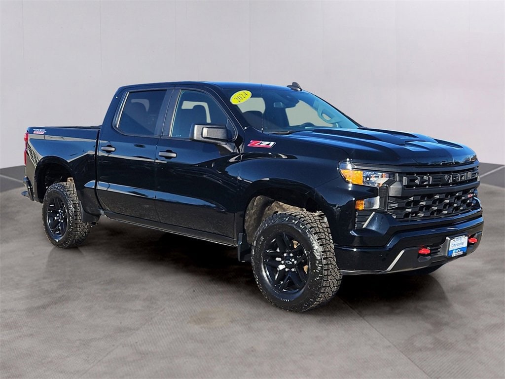 This 2024 Chevy Silverado 1500 Custom Trail Boss Crew Cab 4x4 in Black is Chevrolet Certified and ready for off-road action with 53,704 miles. Finished in black on black, it features a factory 2-inch lift, Z71 off-road suspension, Goodyear Duratrac tires, blacked-out styling, and a rugged stance that stands out on any terrain. With a spacious crew cab and aggressive performance, this Trail Boss delivers both capability and comfort backed by Chevys Certified warranty.