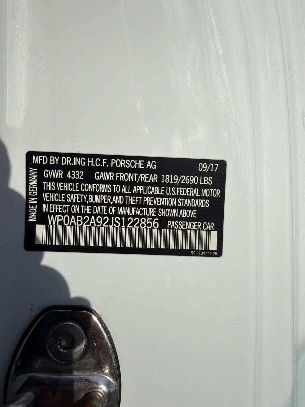 991420 911 Carrera 4SBM Leather Interior in Black/Bordeaux Red 0Q WhiteP3E Premium Package Plus i.c.w. Power Sport Seats (14-way)XEY LED Headlights in Black with Porsche Dynamic Light System Plus625 Porsche Entry & Drive276 Automatically Dimming Mirrors630 Light Design Package342 Seat Heating541 Seat VentilationP3P Sport Package529 SportDesign Exterior Mirrors470 Rear Axle SteeringQR5 Sport Chrono Package176 Sport Exhaust System with Tailpipes in Silver858 GT Sport Steering WheelCWJPORSCHE and 911 Carrera 4S Logos Painted - BlackCAS Model Designation Decals on Doors in BlackXXP Tinted Taillights653 Electric Slide/Tilt Sunroof in GlassCNG Lower Rear Fascia PaintedXAJ Side Skirts Painted in Exterior Color250 7-speed Porsche Doppelkupplung (PDK)658 Power Steering Plus030 PASM Sport Suspension (Lowered 20 mm)XDK Wheels Painted in Satin Black456 Adaptive Cruise Control (ACC)457 Lane Change Assist (LCA)489 Heated Multifunction Steering WheelP06 Power Sport Seats (14-way) with Memory Package583 Smoking Package581 Luggage Net in Passenger FootwellXSC Porsche Crest on HeadrestsEKG Interior Trim in Carbon Fiber i.c.w. Leather Interior 9VL BOSE® Surround Sound System497 Preparation for Rear Logos Painted970 Preparation for Two-Tone Leather Interio